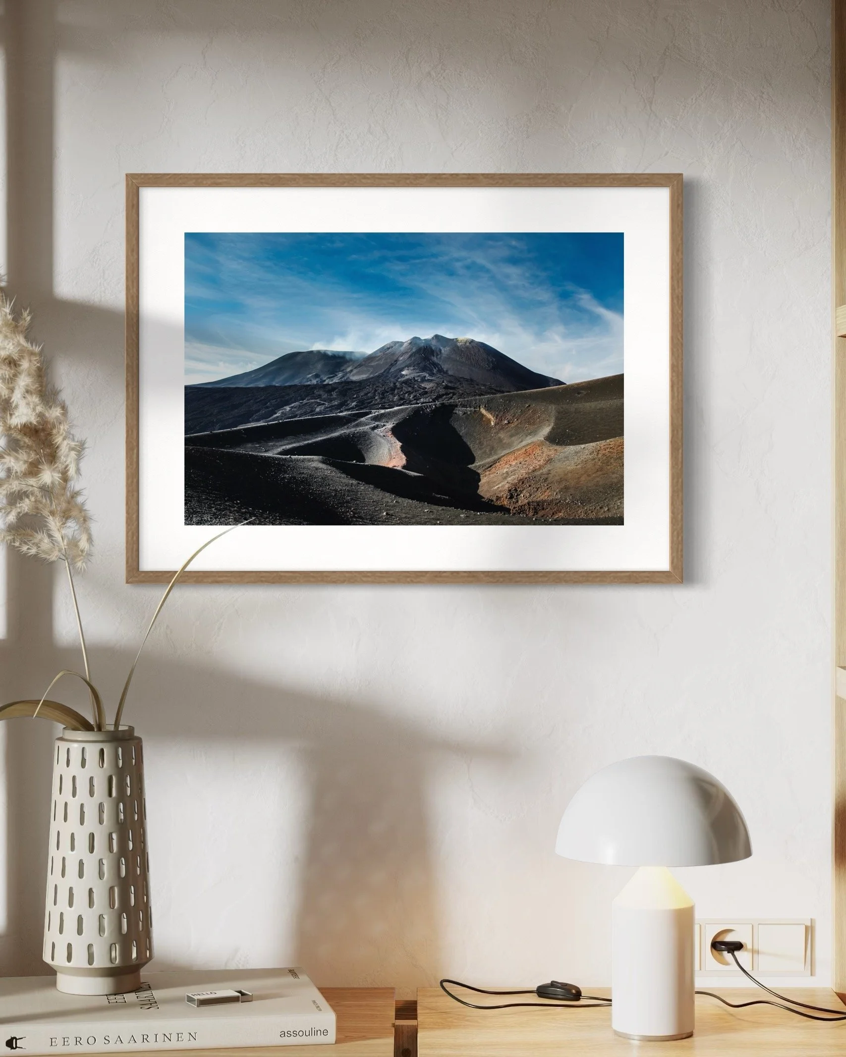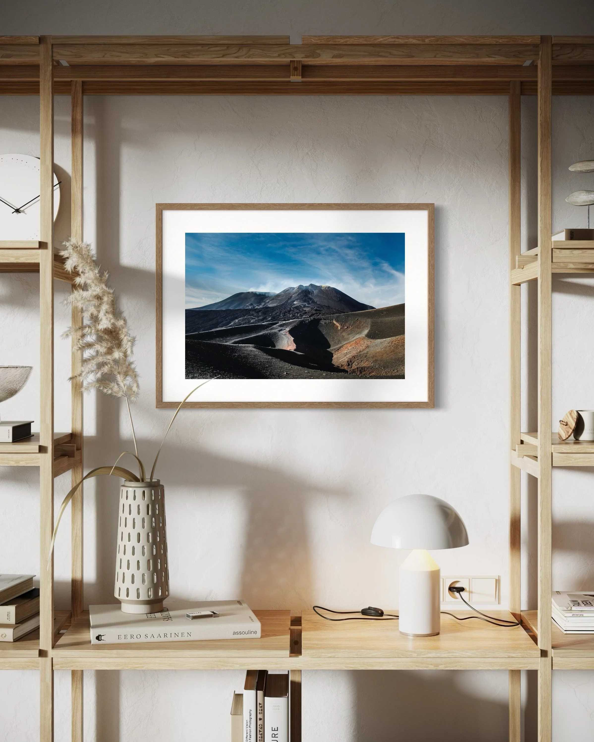 Veduta aerea delle Langhe, stampata su carta fotografica Fuji. La brillantezza del supporto esalta i verdi intensi delle colline e l’azzurro profondo del cielo, restituendo tutta la ricchezza cromatica di questo paesaggio unico. La stampa è completata da passepartout bianco e cornice piatta nera, per un risultato elegante e senza tempo che valorizza l’armonia e la profondità della scena.